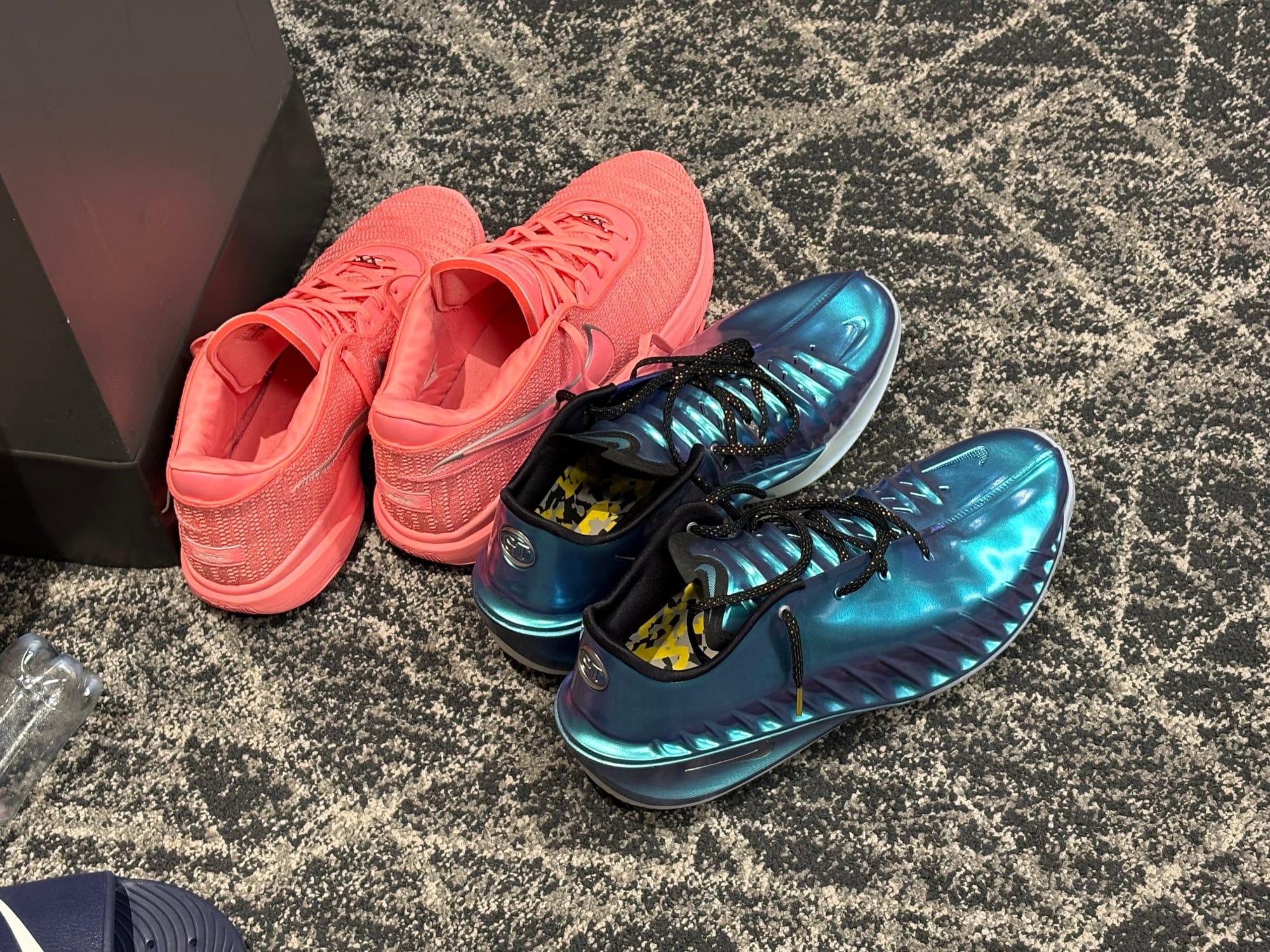 Then, the arena went dark for the pyrotechnics that go off during the announcement of the Cavaliers starters. Perfect timing for Potter to change his shoes. Both the blue and pink pair were sitting by the Pacers bench – T.J. McConnell brought them both out moments earlier.