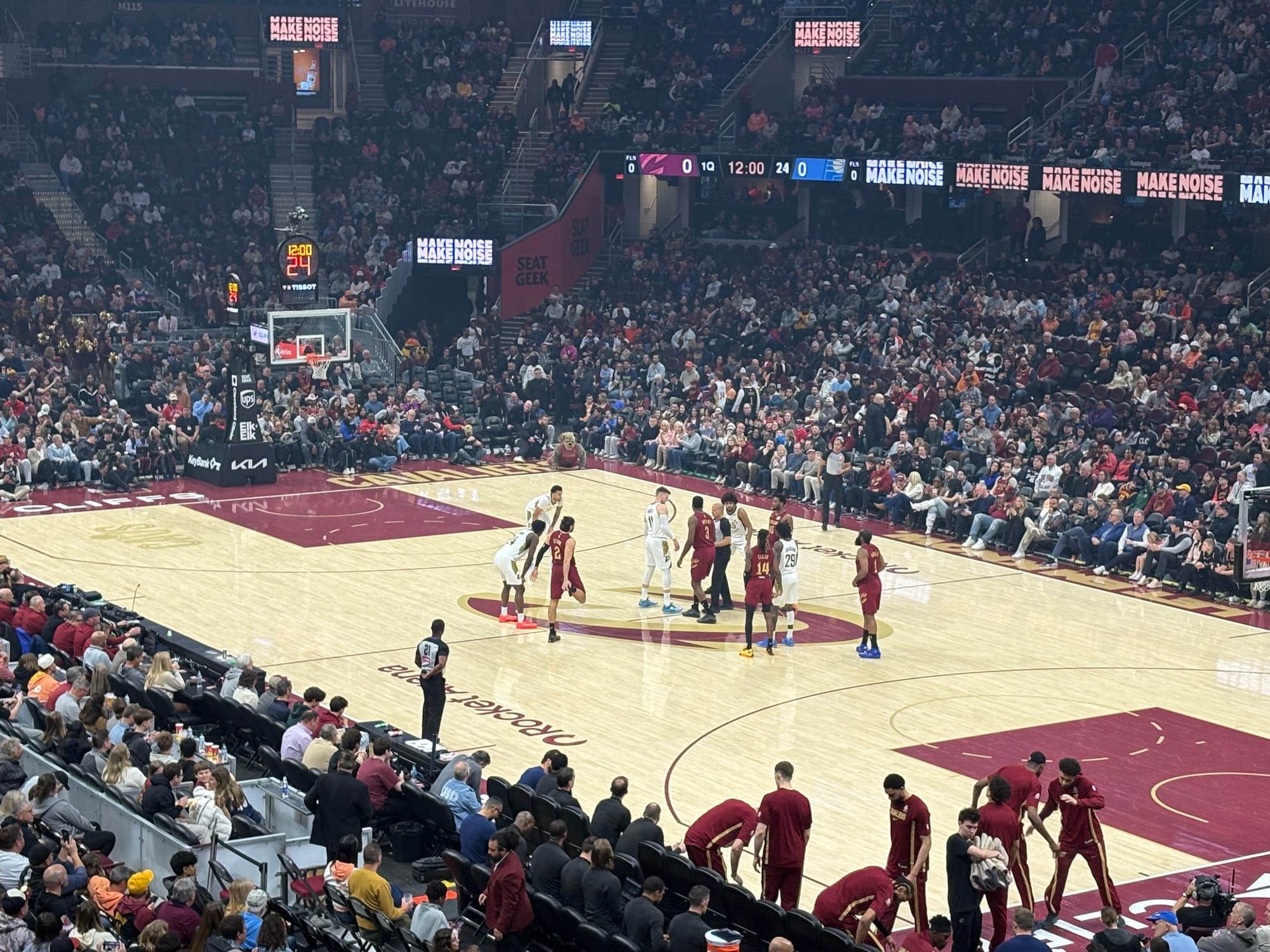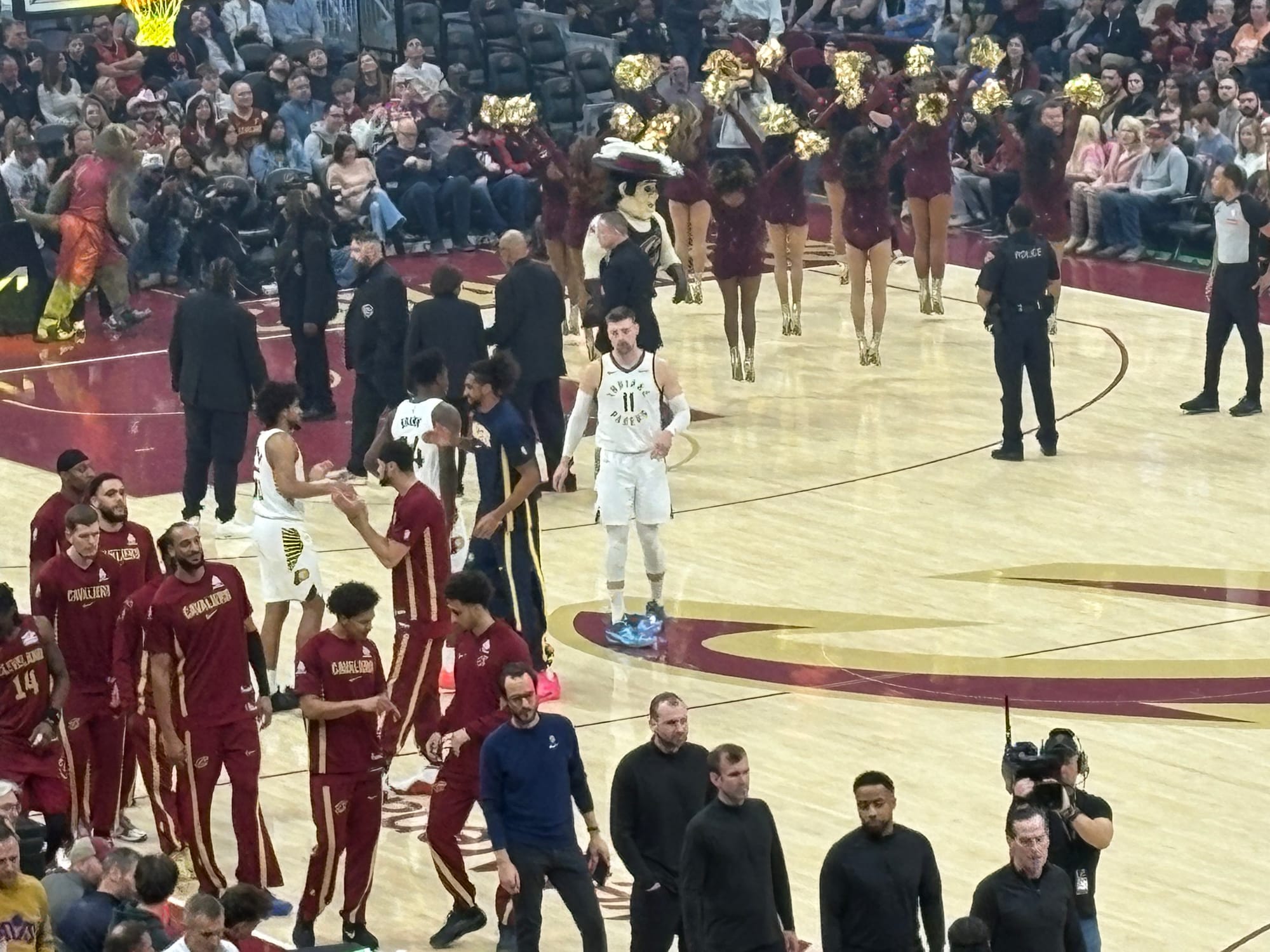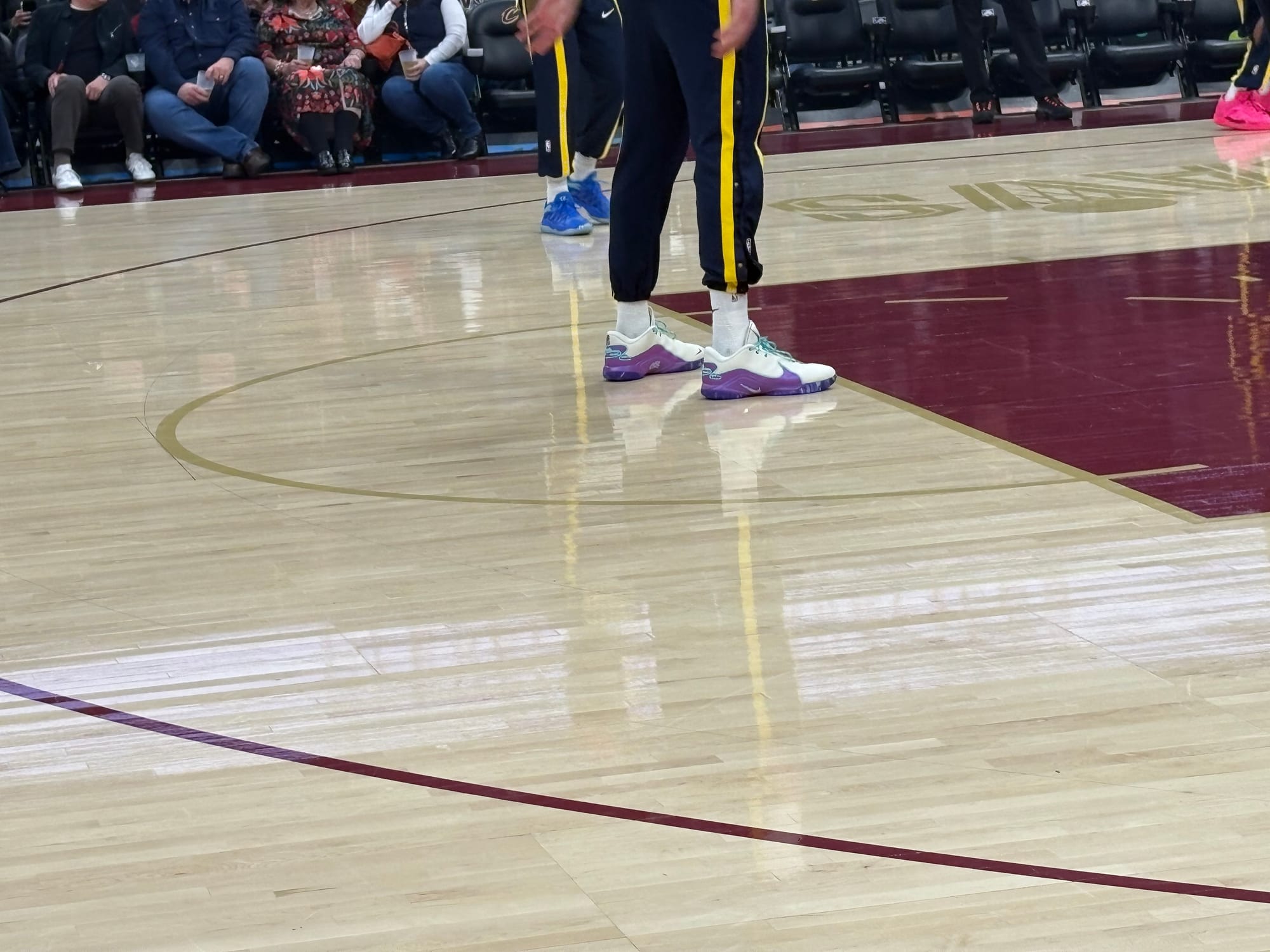 After warmups was the National Anthem, during which Potter huddled up with Jalen Slawson and Obi Toppin. Then, player introduction. The Pacers, as the road team, had their starting lineup announced first. Potter was the only player to hear some cheers from the Cleveland crowd, and he was still wearing his white and purple shoes.